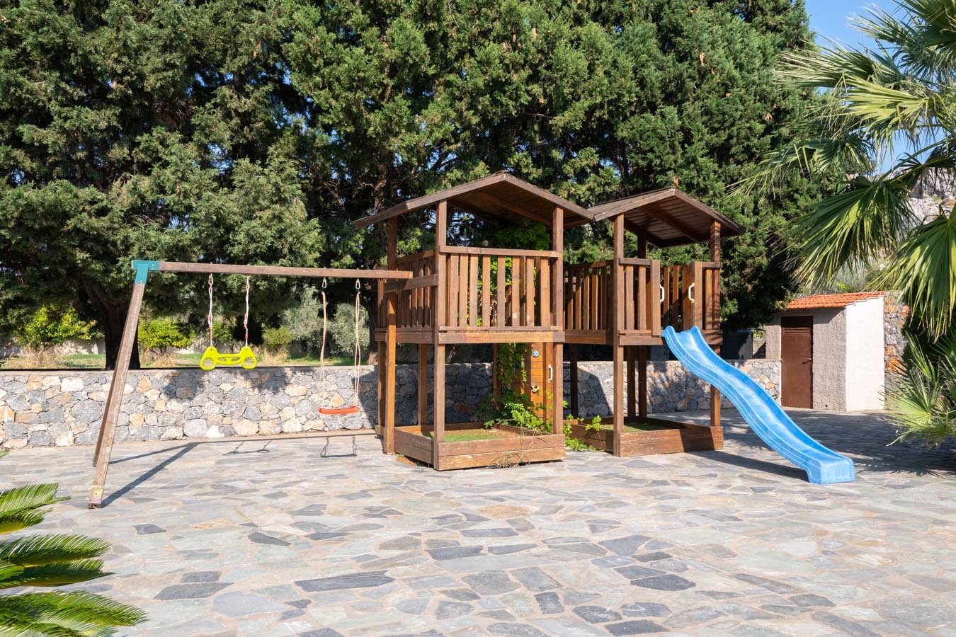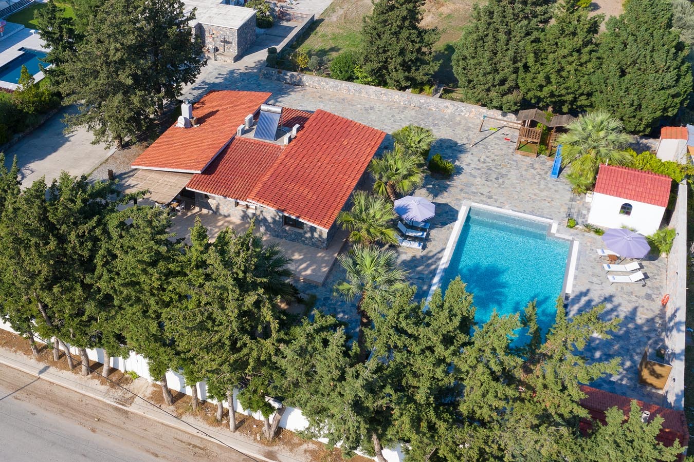 Madia villa has 3 modern bedrooms, 2 of them with double beds and 1 of them with single beds. There are 2 bathrooms in the house, each has a shower. There’s an open plan kitchen in warm colors accompanied from the sitting area. The kitchen is fully equipped for any meal preparation. Also, at the same space there’s the wide living room in relaxing tones along with the screen TV. There’s a free Wi-Fi access throughout the property. Outdoors, guests will find their wonderful private swimming pool with its sunbeds as well as a Jacuzzi. Also, there’s a playground for kids to enjoy some carefree moments and be happy. Prepare to relax and clear your mind under the Aegean sun. There are BBQ facilities and a sitting area so as you can enjoy a gathering with your loved ones.